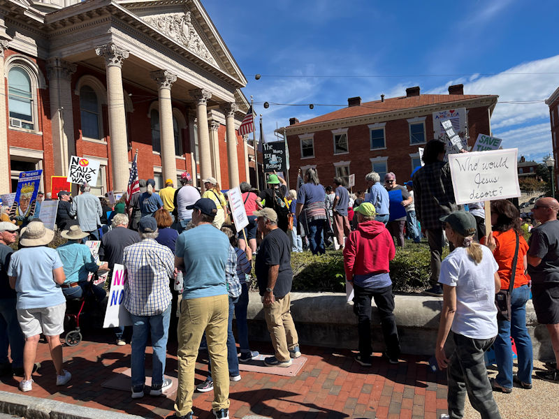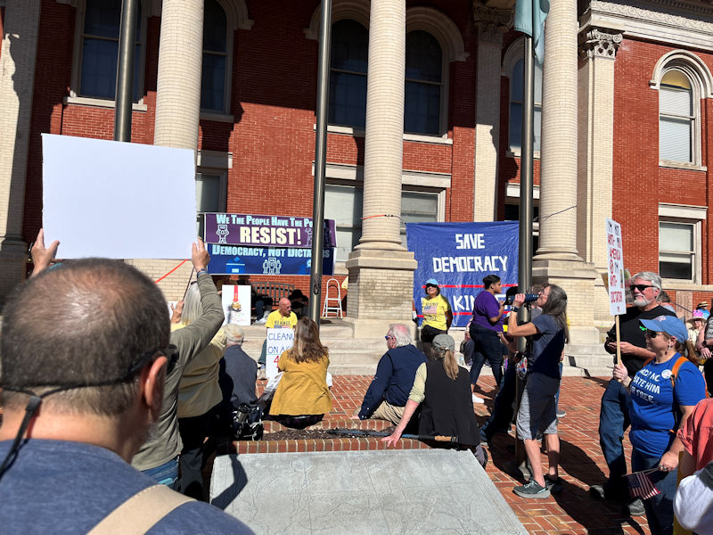 The first 'No Kings' demonstration was held in the same venue on 14 June 2025, reportedly with good attendance, but we were halfway across the country and missed it here. Today, however, here we are for 'No Kings II', 18 October, and we learn from reports of the many other demonstrations round the country, estimated at 2,700 of them with an estimated turnout of some 7 million patriotic citizens, it's all been hugely successful -- with a general atmosphere both joyful at the camaraderie of the participants and a range of serious grievances against the present lawless regime.