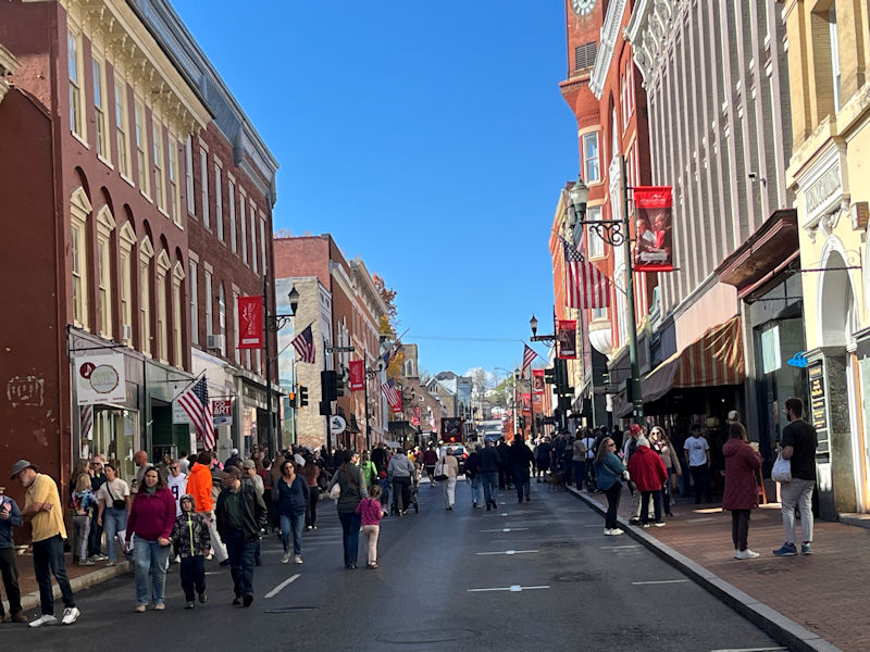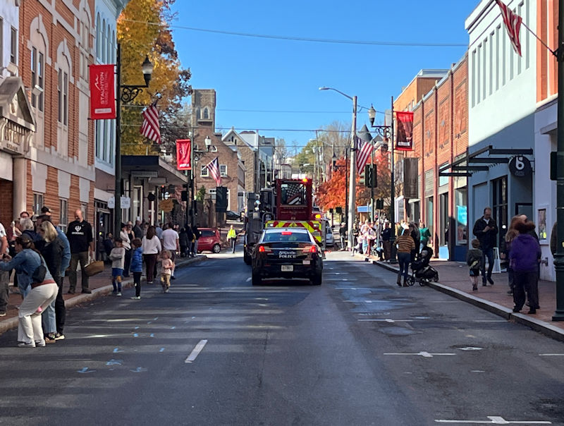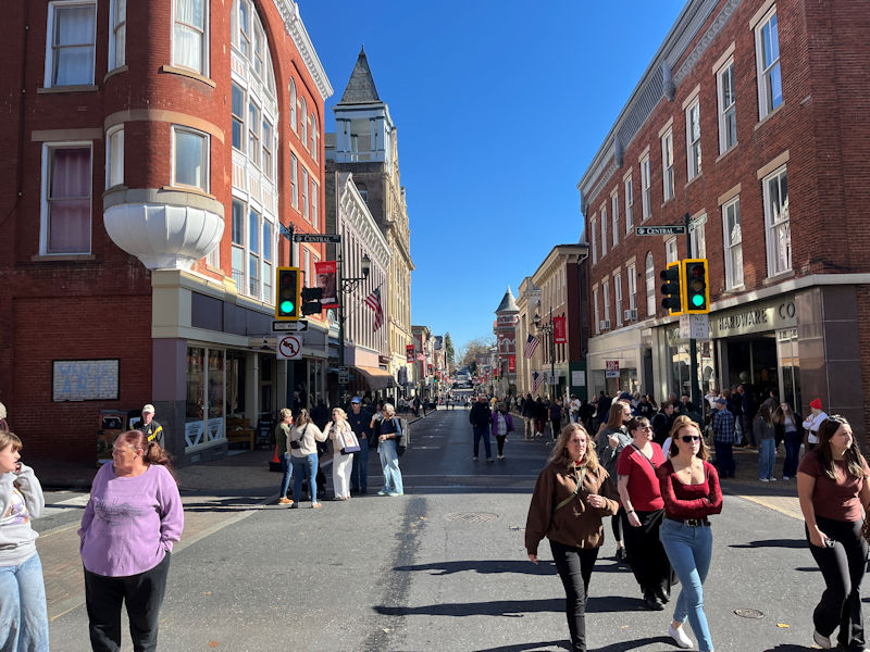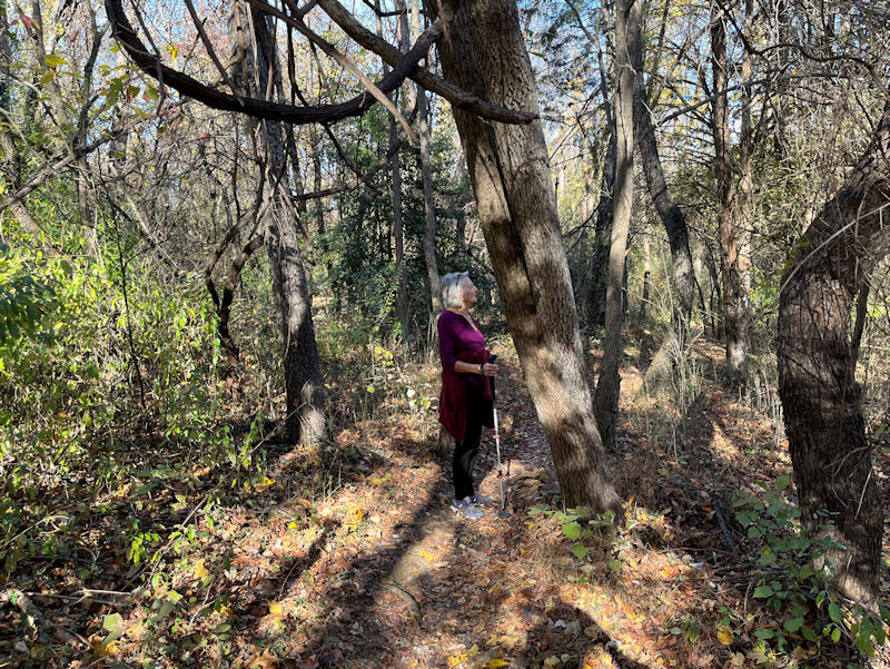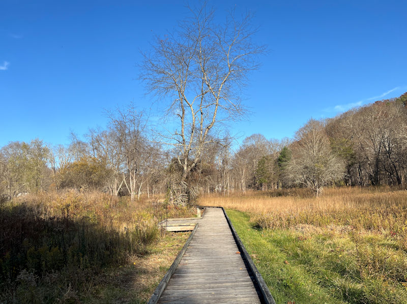 Montgomery Hall Park in Staunton VA, the informal entrance from the southern carpark, 4 November 2025. The little iPhone camera is all charged up.