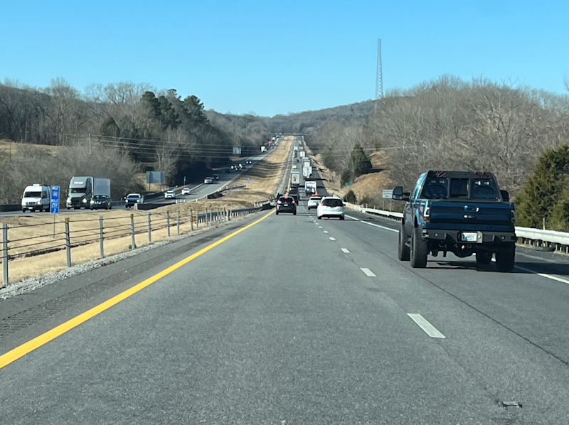 Now, blasting out at an earlyish hour, we're wending westward on I-40 (from this point nearly to our destination), 19 December 2025, with so far very forgiving traffic on the road.