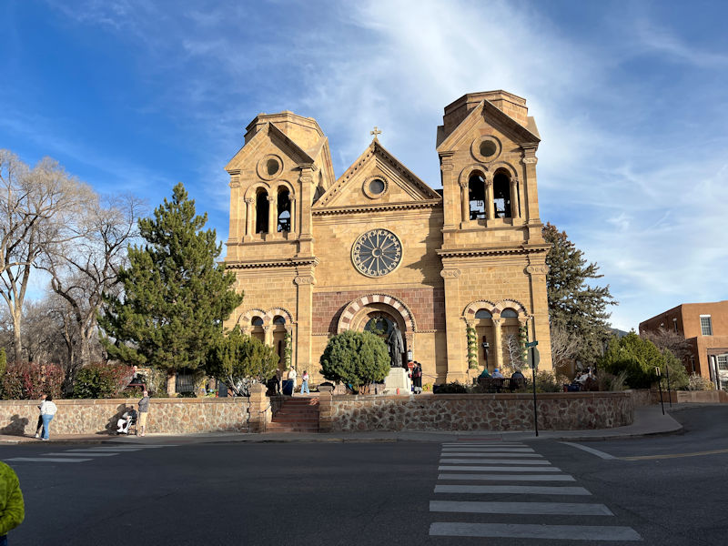 The Frenchman Jean-Baptiste Lamy (1814-1888) was assigned to Santa Fe in 1851, and he created the cathedral in 1869 in a French Romanesque Revival style, employing French architects and Italian stone masons (standing well out from the adobe styles of this region); it was dedicated in 1887. A 1915 bronze statue of the good archibishop is seen here in front of the door.