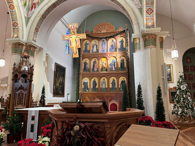 In the sanctuary, the screen (or reredos) behind the altar, created in 1986 for the cathedral's 100th anniversary, has an 18th century statue of St Francis in the centre, with painted images of saints of the New World all round him. The dangling crucifix above the altar is said to be a replica of the one in Assisi from which Christ spoke to St Francis, and like that one it's called the 'San Damiano Crucifix'.