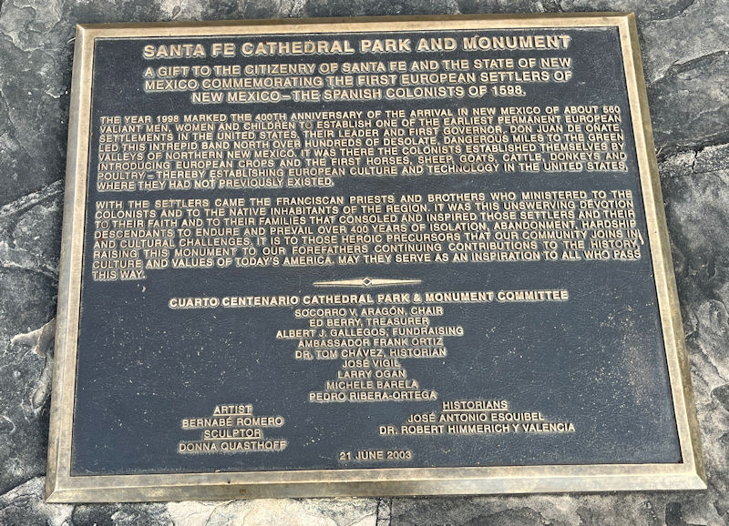 It's known as the 'Santa Fe Pioneer Monument', i.e. in honor of 'the Spanish colonists of 1598' and the Franciscan missionaries who came with them. The various people-types and animals on this side are matched by others on the far side (which we'll come to see in a few days).