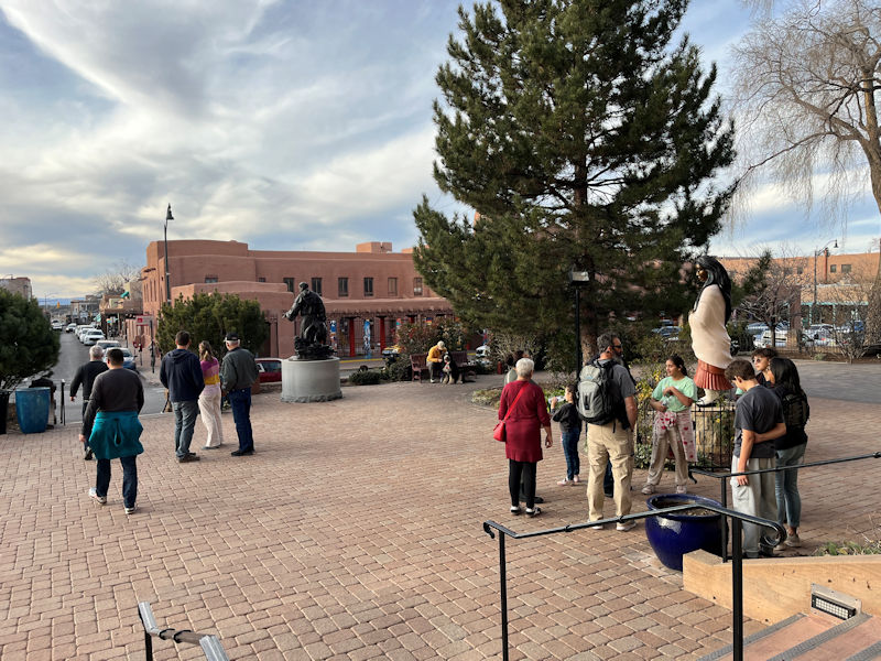 Across the street, that's the Museum of Contemporary Native Arts, in appropriate adobe style. During a decline in the city's fortunes in the late 19th century, it was determined that henceforward it should 1) emphasize an appropriate uniform architectural style, and 2) lean heavily into the cultural virtues of its Indigenous, Spanish, and American heritages.