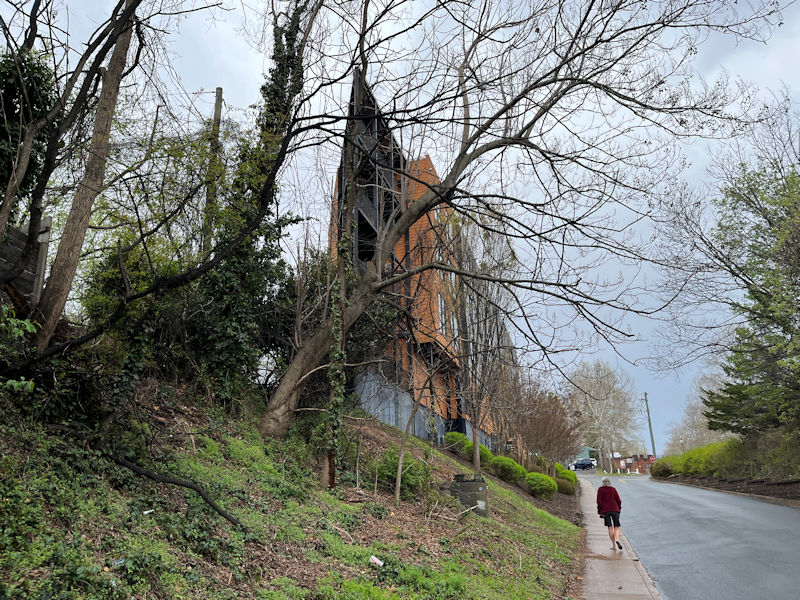 Alison was taking the Amtrak down to Charlottesville, but the tracks are being repaired somewhere and the two hour train ride turned into a four hour bus trek. So whilst waiting we've been canvassing the neighborhoods looking for funny apartment blocks to photograph. Here's one.