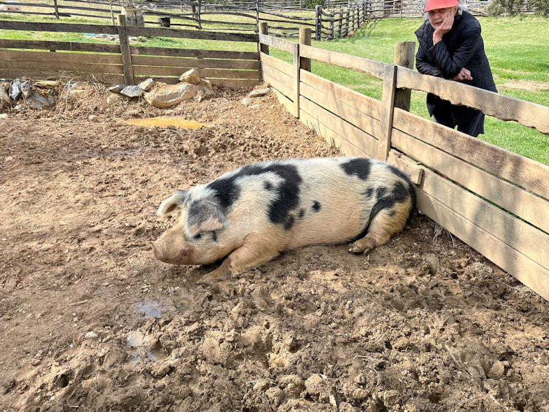 Moving along, that's Dalley. There were three enormous monstrosity pigs here, but we've just learned that Sunshine passed away over the winter. The third one, Trouble, lives in the barn at the end of the American section.
