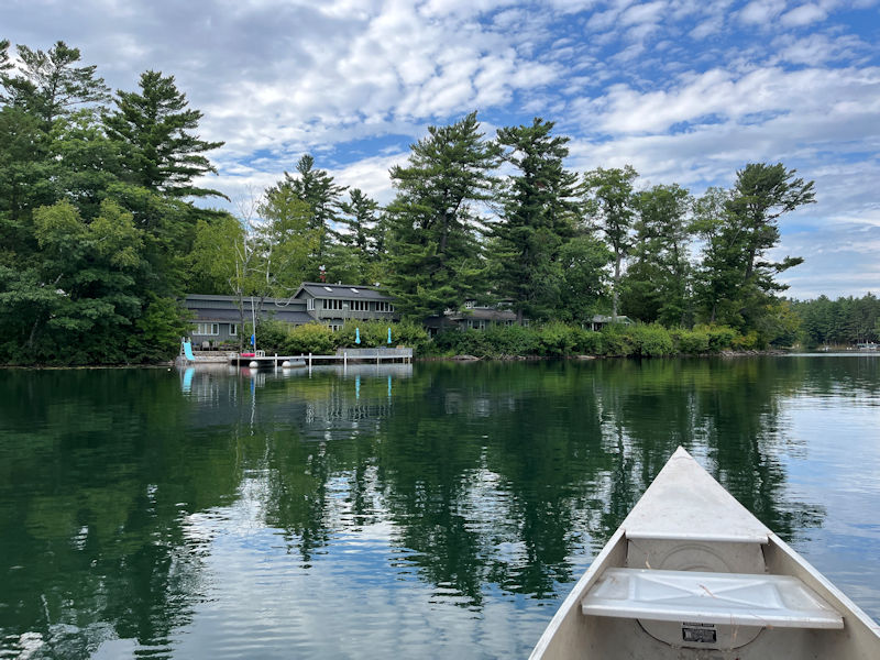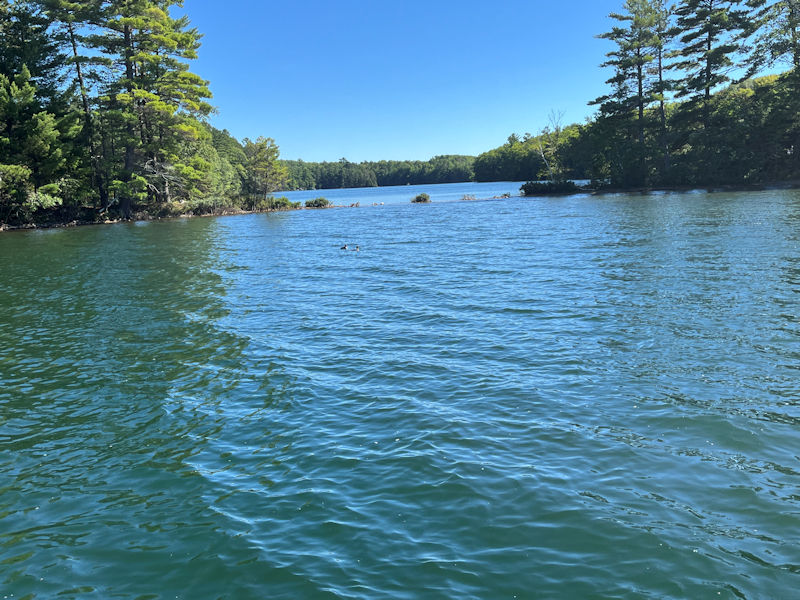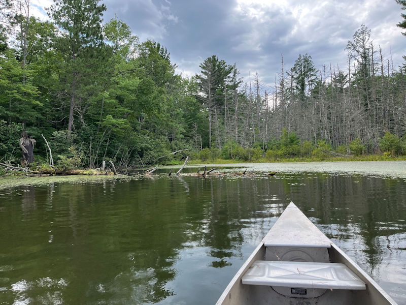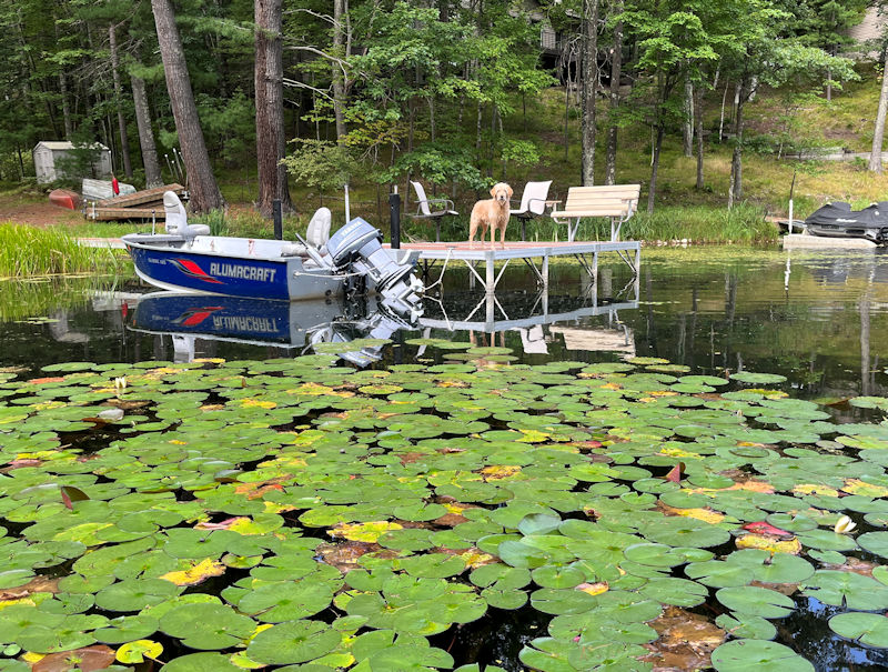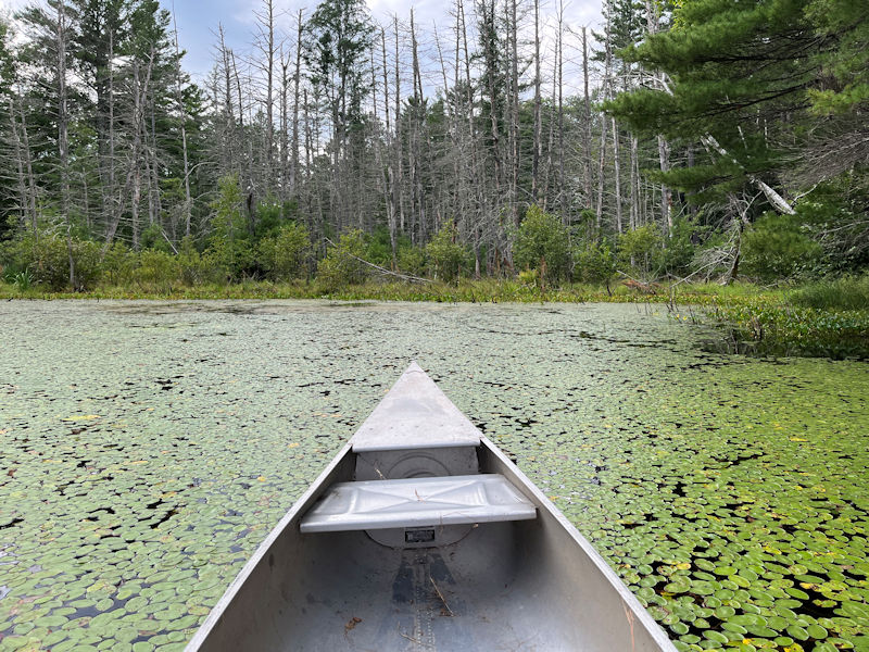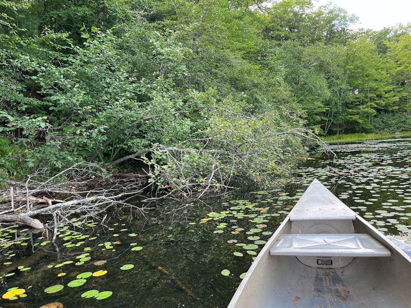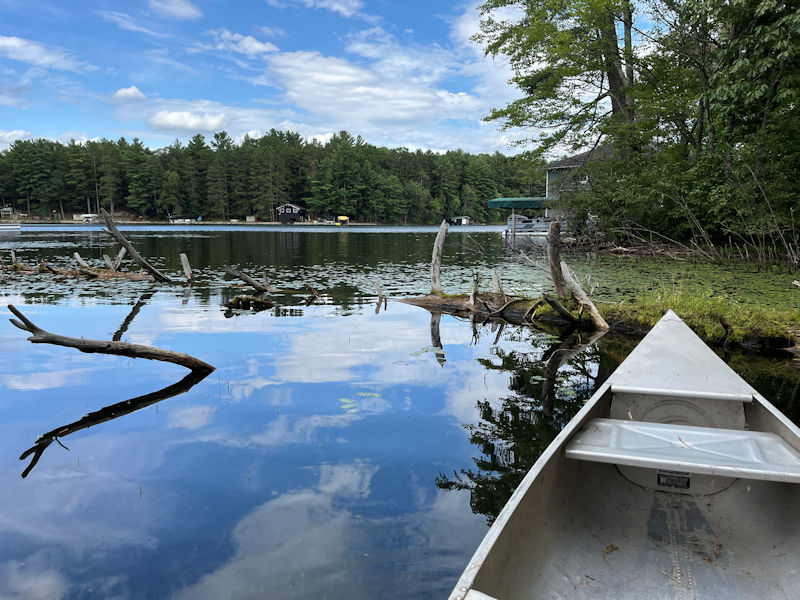 This apparently open water has in recent years been incrementally choking up with submerged 'muskie weed' or 'pondweed', spreading across the non-lily pad side of the cove -- a grand nuisance for the boatowners along that shoreline. On this trip in, however, we noticed that those submerged plants are much less evident, and we've just learnt that someone has doused them with a toxic herbicide. Big bummer.