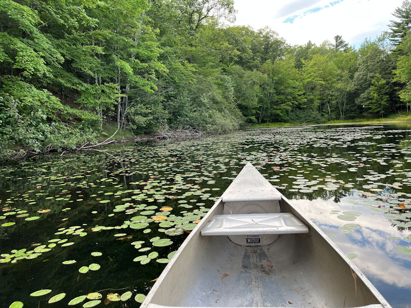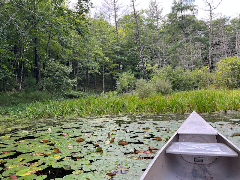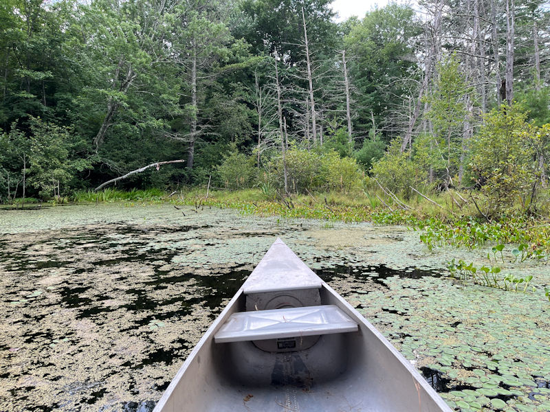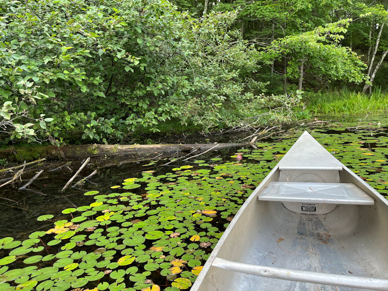 This lake is basically spring fed, sometimes from under water but often from mini-creeks entering from the forests. Over the years, when those creeks reach the shoreline, they tend to spread out and make a small marshy delta -- these are uninvestigable on hydrobikes (they would take 3 seconds to lock up the propeller), but at least once a summer we enjoy paying them a visit in the old Grumman canoe.