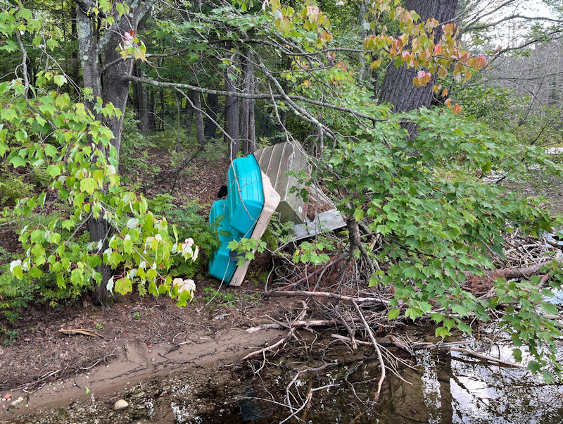 On the left, a serviceable rowboat (very seldom used nowadays), and a beautiful classic Old Town canoe on the right (we've never seen it used at all), and in the middle, an interesting something-or-other that brother Eric is very fond of.