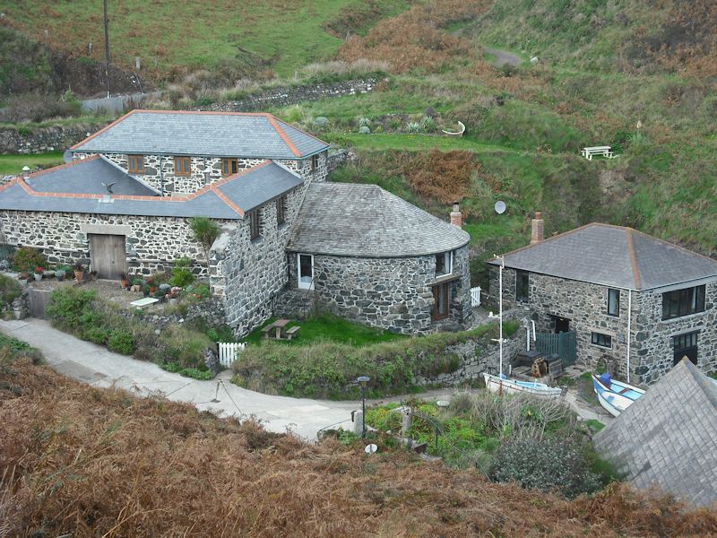 The Cadgwith fishing boats and the inn, with Ruan Minor a ways up the hill. Cadgwith was the location for a well-regarded 2004 film directed by Charles Dance, Ladies in Lavender, starring Judi Dench and Maggie Smith.