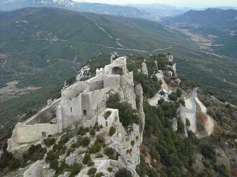 This is just a warm-up. This is the 10th-century Puilaurens Castle, one of the "five sons of Carcassonne" in the stark mountainous "Cathar country" south of the city that, after France put paid to the Cathar heretics, served to cover the then-frontier between France and the Kingdom of Aragon.