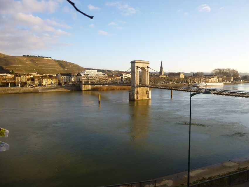 On our preprandial stroll -- that's Tournon's castle, and our hotel to the left -- we cross the bridge to the neighbor town of Tain l'Hermitage. We're lodged in the Ardèche department, whilst Tain is in the Drôme, and we can walk across from one department to the next just like that on (in fact) a passerelle foot-bridge built by the Seguin brothers in 1849. They also built the first cable suspension bridge in Europe, in 1825, right here, but that was knocked down in 1962 to let the big boats through.
