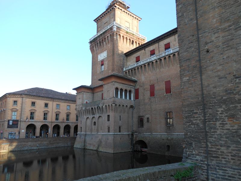 Here's the rainy view from our terrasse. Ferrara began as a ford over the River Po (which later evolved into a southern branch of the Po) and was first mentioned under Lombard rule in the 8th century. In 1146 the last of the ruling Adelardi family died without issue, and the city came by marriage to Obizzo I of Este -- after a century of squabbling with the other leading clans in town, the Este family were recognized as perpetual lords of the city and moved here permanently.