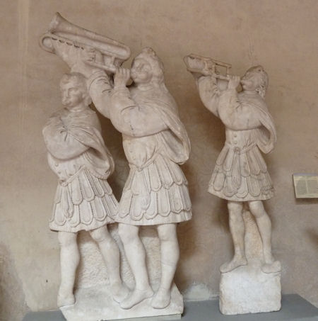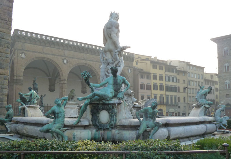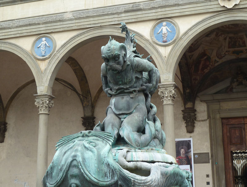 The awful Neptune Fountain in the Piazza della Signoria, by Ammannati with an assist from Giambologna, boasts still another tribute to Cosimo I de' Medici (like most everything else roundabout) in the main piece, no better or worse than others in the genre, but the figures surrounding the fountain are truly misshapen and horrible.