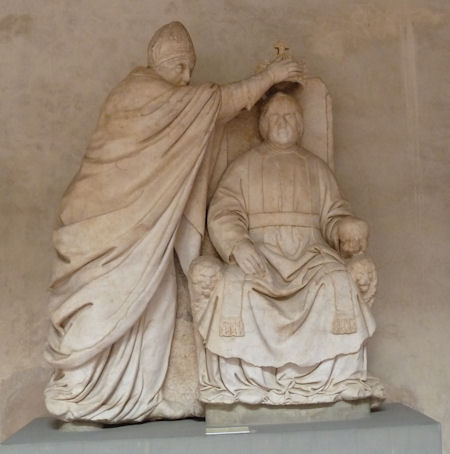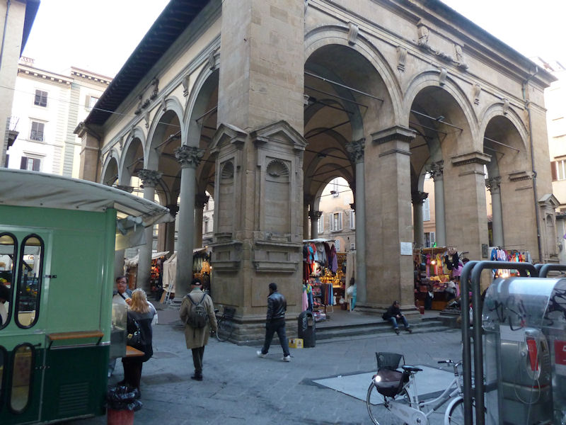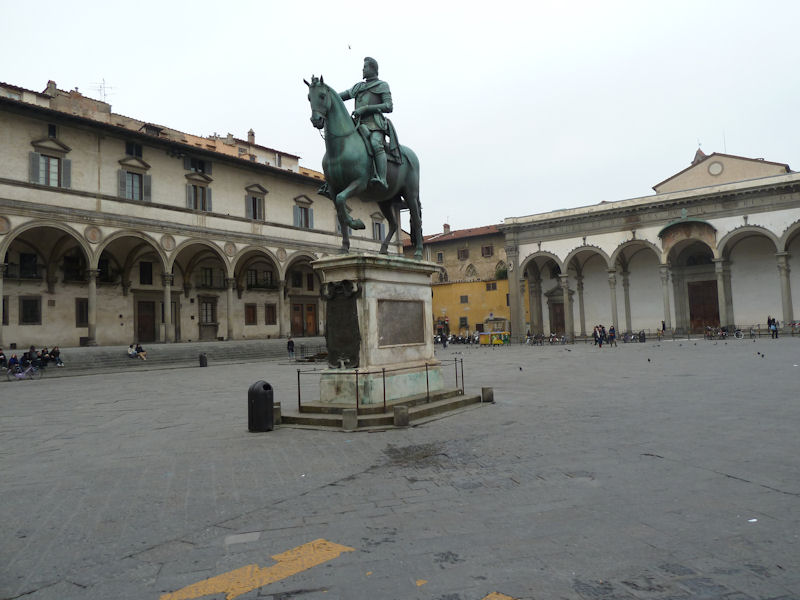 The Piazza Santissima Annunziata, out the front door of the Ospedale degli Innocenti, the orphanage founded by the Silk Guild and built by Brunelleschi beginning in 1419. The silly statue, which looks very like another Cosimo I de' Medici, is actually Giambologna's predictable take on Ferdinand I de' Medici, Grand Duke of Tuscany, in about 1608.