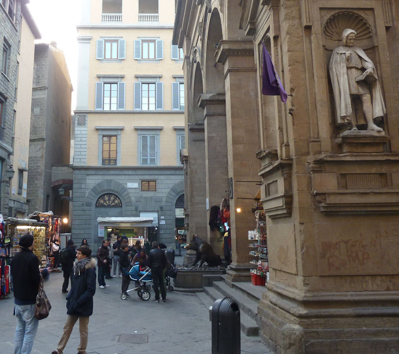 ). Purpose-built or at least converted in 1911 to bring Dante memorabilia to the masses, the "Casa di Dante" is in the Alighieri family's neighborhood, right enough, and now houses the Dante museum a few doors up from "Dante's church" in that alley. The great poet certainly did haunt these very streets for his first 36 years, but he was forced into exile amidst the White and Black Guelph factional fights in 1302 and ended his life in Ravenna in 1321. Ravenna refused to send his remains back to enliven Florentine tourism.