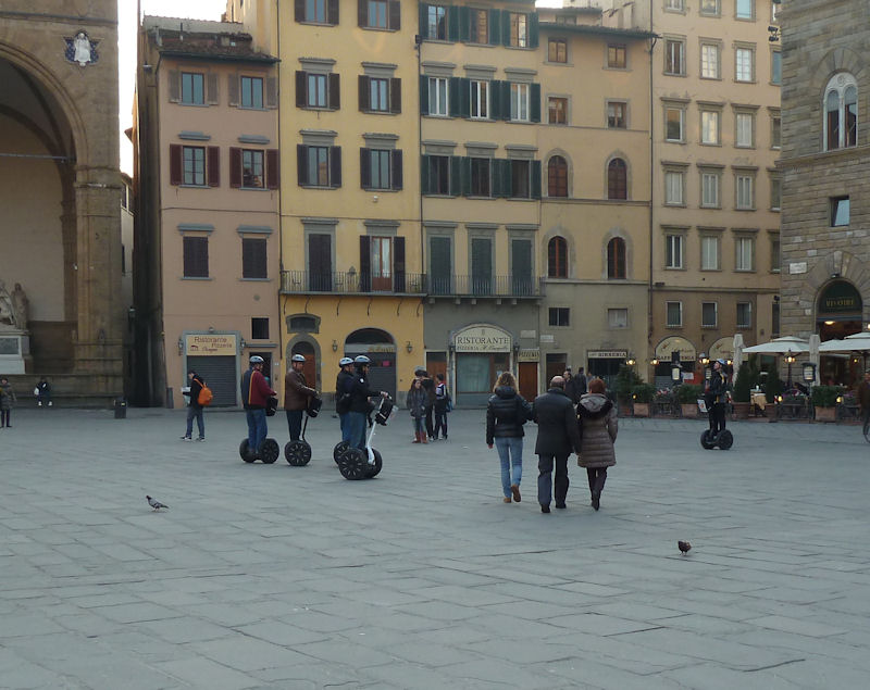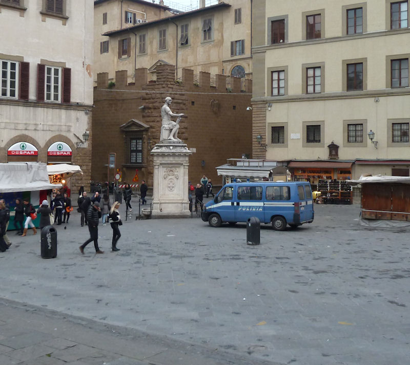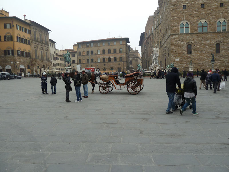 The Piazza della Signoria, with Big Cosimo on his bronze horse and a real horse waiting to gallop up and down the thoroughfares.