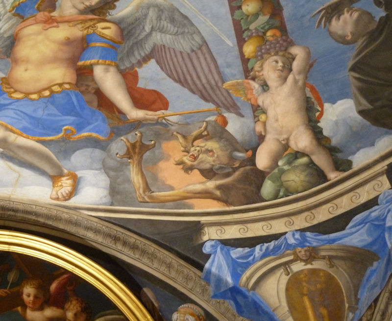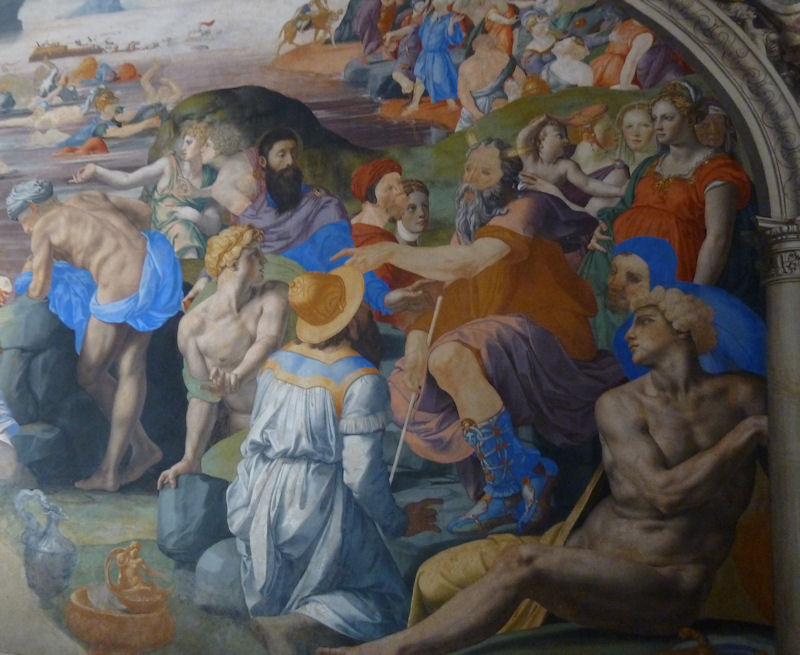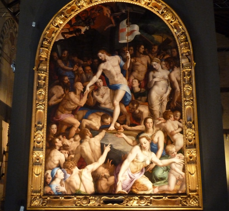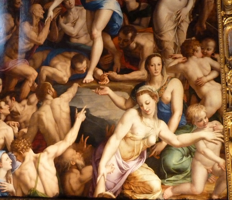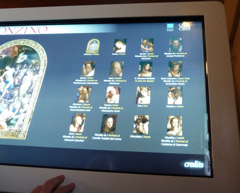 What a babe, in the blue gown. Almost as pretty as Bronzino's portrait of Lucrezia Panciatichi. Following the confusions of the Florentine flood of 1966, this thing only resurfaced (so to speak) in 2003 and has been magnificently restored, with the touchscreen didactics alongside it. [What a babe. Still, no Lucrezia Panciatichi.]