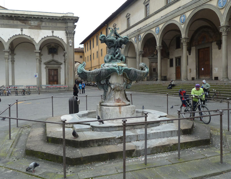The goofy fountain, dating from 1640, outside the orphanage of the Innocents (right)