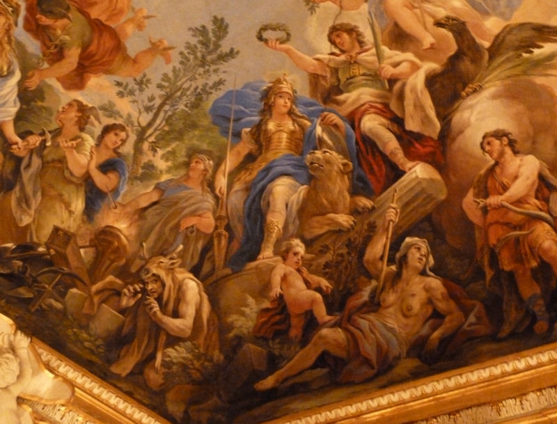 The Hall of the 500, built in 1494 for the republican Grand Council of 500 members, enlarged half a century later by Vasari for the Grand Duke Cosimo I. The enormous Vasari frescoes all over the walls instruct us in the military brilliance and valor of . . . Cosimo I, the Grand Duke.