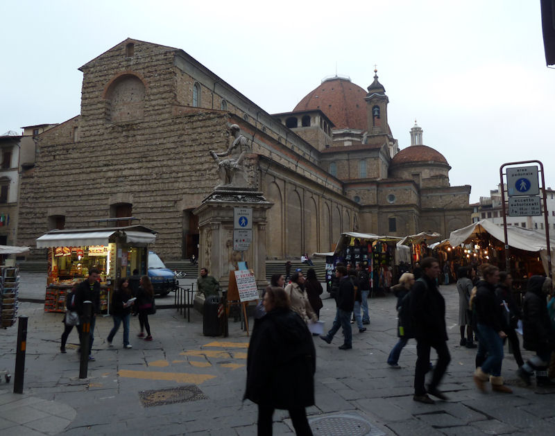 The Basilica di San Lorenzo, parish church of the Medicis (they're all buried there). It was begun in 1419 to a design by Brunelleschi and sort of completed by 1459, but the city of Florence is presently still debating whether to finish the façade.