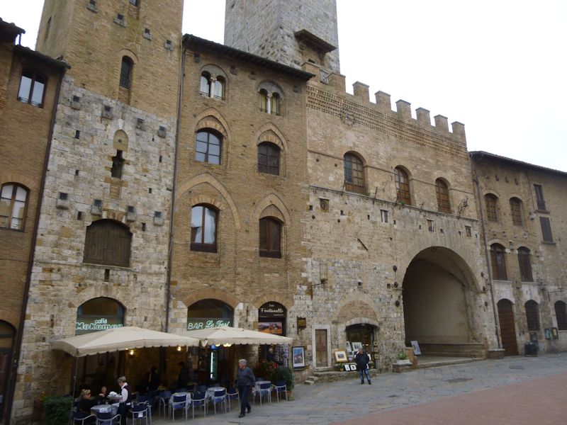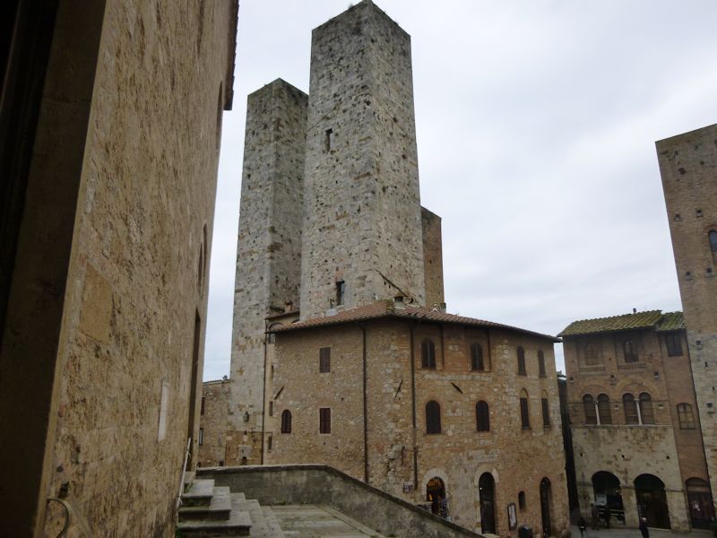 Towards the Piazza Duomo. As in many Italian cities, with the evolution to more orderly civic government in the 16th century or thereabouts (depending upon local conditions), the city administration ordered the demolition or truncating ["lopping"] of private fortified towers, and there are presently only 14 towers remaining in San Gimignano (we counted 11, but a lot depends upon definitions).