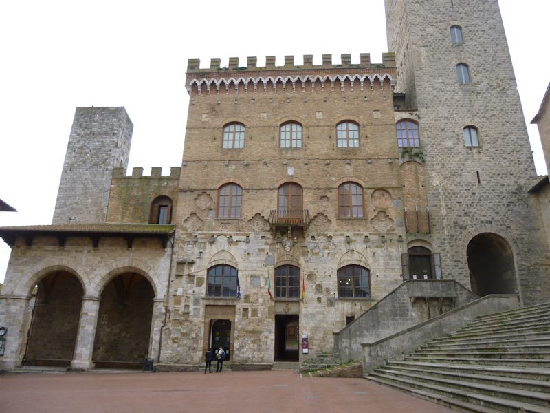 Another view of the Torre Rognosa and, beyond it, the former castle of the Bishops of Volterra, later a Dominican convent and then a prison, once graced by the presence of Girolamo Savonarola when he preached his fiery sermons in the Collegiata here in 1485 and '86. The Piazza delle Cisterna is on the lower right.