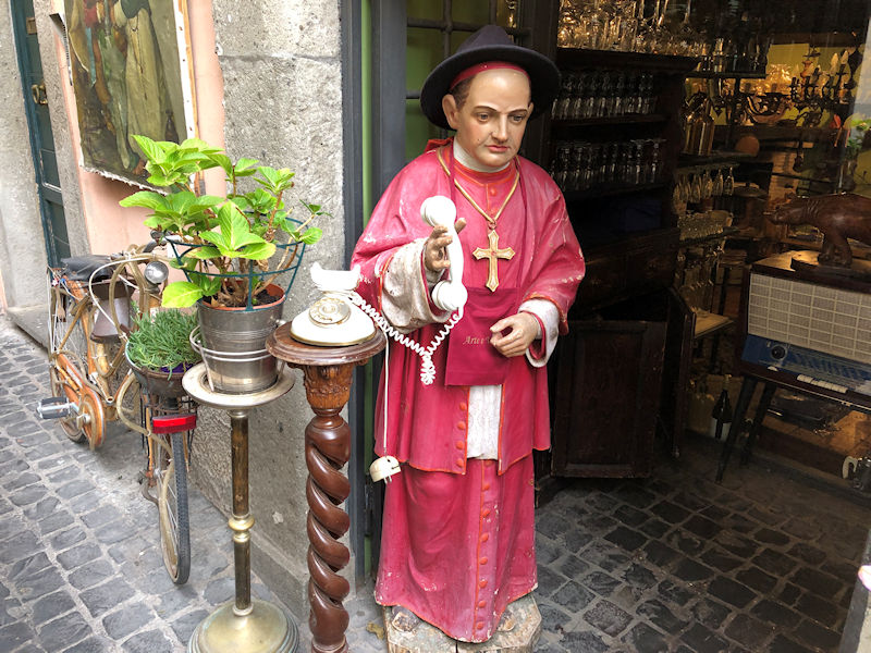 We've so far been unable to score a rental car, so we've hopped a bus down the mile and a half to Albano Laziale, a more populous but equally historic city also bordering on the southern rim of Lago Albano. We're seeking a proper supermarket, rather desperately. This main road through the upper town is in fact the Via Appia Nuova (the original, the Via Appia Antica, was farther down the hillside, before the Albano-Ariccia bridge was built over a ravine, which we'll soon see, in the 19th century.)