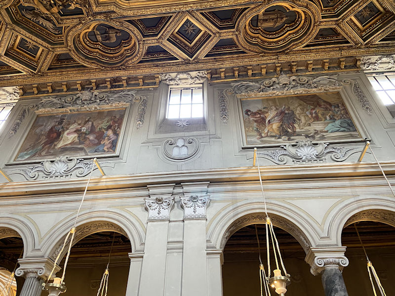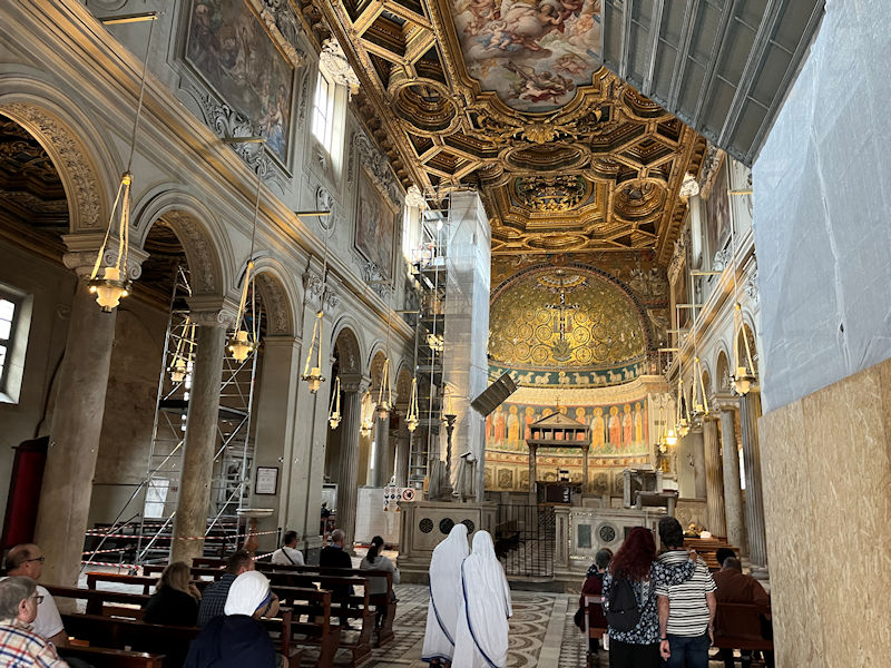Works in progress: The narrow nave and left-side aisle facing the altar, with off to the right the other side aisle and the small monastery grafted onto the north side of the church. The basilica was gifted to the Irish Dominican order in 1677 because of persecutions at home and now consists of 12 members who 'have the care of the basilica of San Clemente' and 'providing a liturgical service to the local Italian community'.