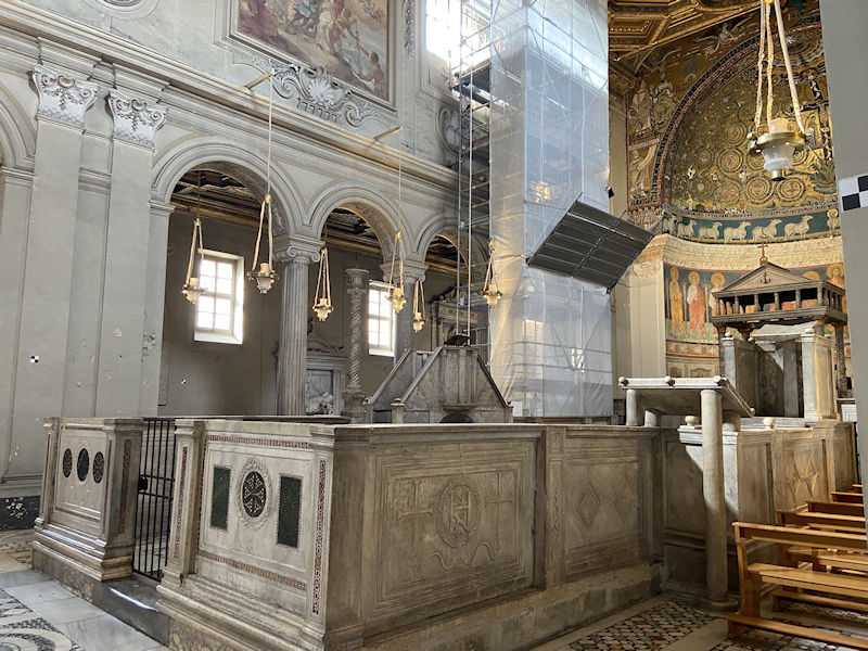 A first look towards the apse and altar, with projecting in front of it the walled schola cantorum or choir area, much of it brought up during the infilling of the 4th century church, with two ambos or pulpits, the one on the right having been salvaged and the other created for the present church.
