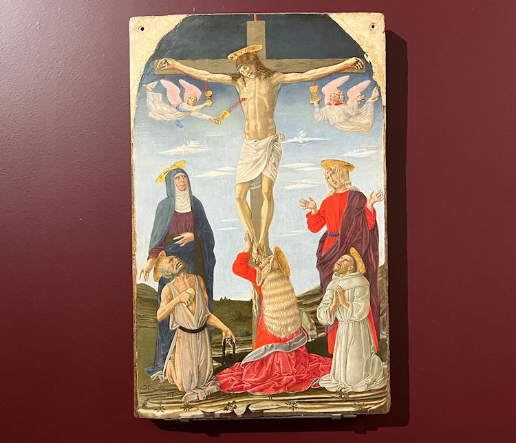 This odd little piece, the crucifixion with St Jerome and St Francis kneeling, is attributed to either Benvenuto di Giovanni or his son Girolamo of Siena, dated to 1490-1500.