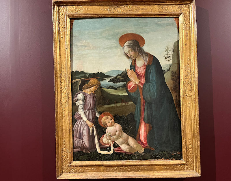 'The Madonna adoring the Child with an Angel', designed for home use evidently, is by Gherardo di Giovanni di Miniato of Florence, and dated to 1480-1490. Baby Jesus either has got hold of a security blanket or he's nicked his mum's veil. It's in oil on panel.