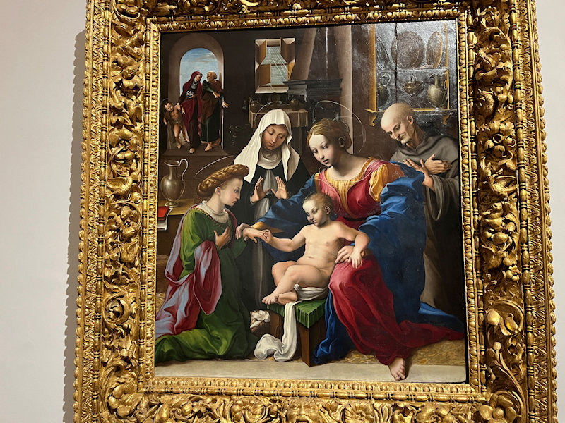 Oh not another 'mystical marriage'. Catherine of Alexandria seems ready for it, though Mary has to hang onto her wrist. Baby Jesus looks a bit like he suspects that there's something wrong with this, whilst Catherine of Siena and the wasted looking St Bernardino of Siena hang about overhead. It is speculated that this was intended to be a tribute to Sulpizia (1489-1557) (same features as the 'bride'), the daughter of Pandolfo Petrucci, the tyrant of Siena and wife of Sigismondo Chigi, the Sienese ambassador in Rome. Anyway, it's by Girolamo Genga of Urbino, dated 1520-1530.