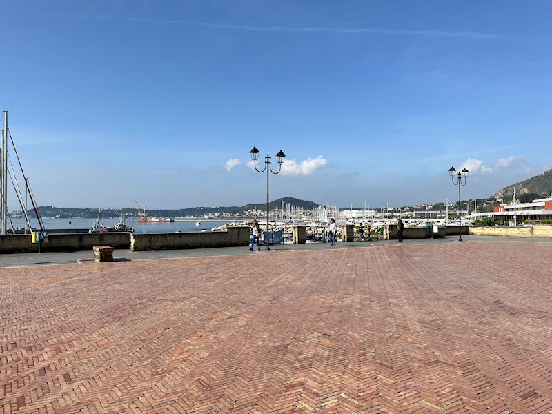 . . . ferries us to an overlook point on the main road and points out the local sights. (That could be the Castello Aragonese di Baia and (behind that) the Capo Miseno off in the distance.)