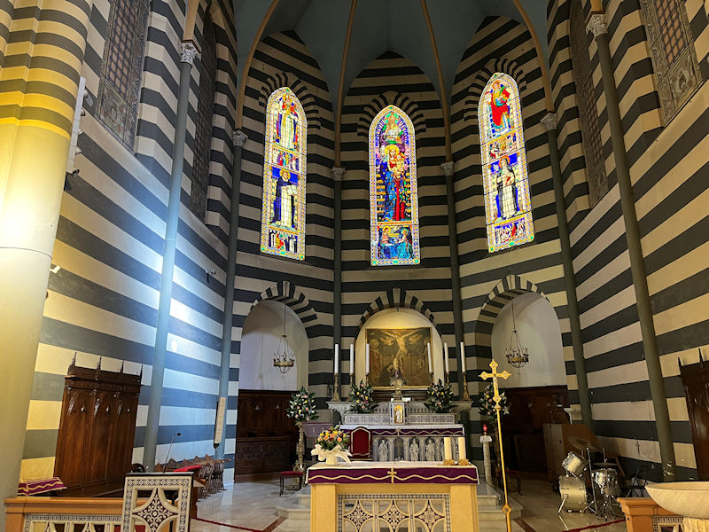 The church has a single nave with side chapels (six on the right, five on the left) -- in 1887, the local designer Luigi Petrucci was commissioned to renovate the interior, 'eliminating all of the 14th century peculiarities of the church' and emphasizing the Gothic sort of verticality. The apse was also lightened by three stained glass windows made in Marseilles in 1884, which however were also bombed out for military reasons, presumably.