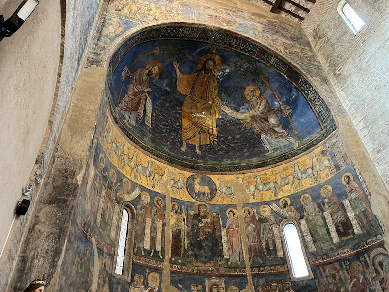 The frescoes from the 12th century decorating the triumphal arch and the apse represent the legend of the Emperor Constantine and St Sylvester.