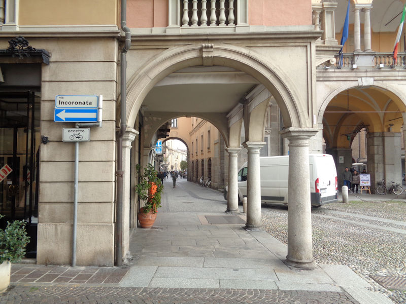 We've been wandering all over in search of the Tempio Civico della Beata Vergine Incoronata -- whoever would have thought that it might be down this alley? Though the street sign's a helpful hint.