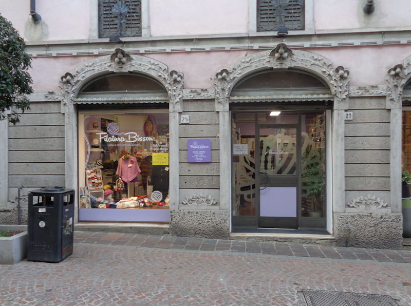We've just been across the river Adda to see the famous Cattedrale Vegetale, and now we're heading back up the hill to visit the Chiesa di San Francesco. We just need to stop off at the yarn shop for a while.
