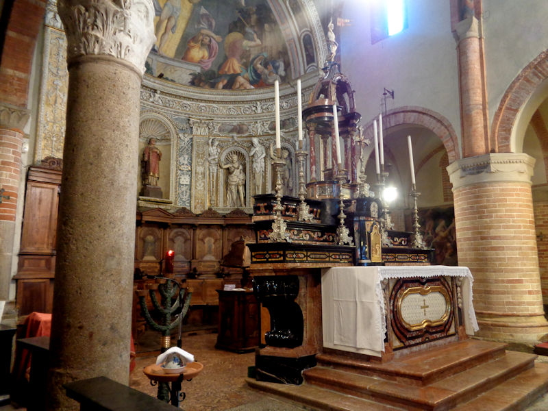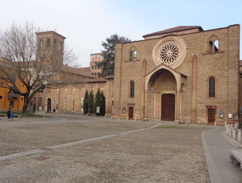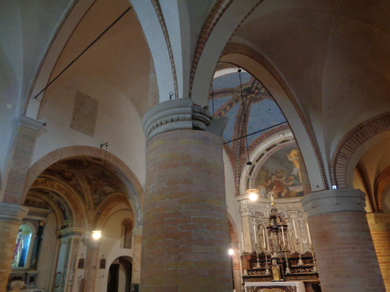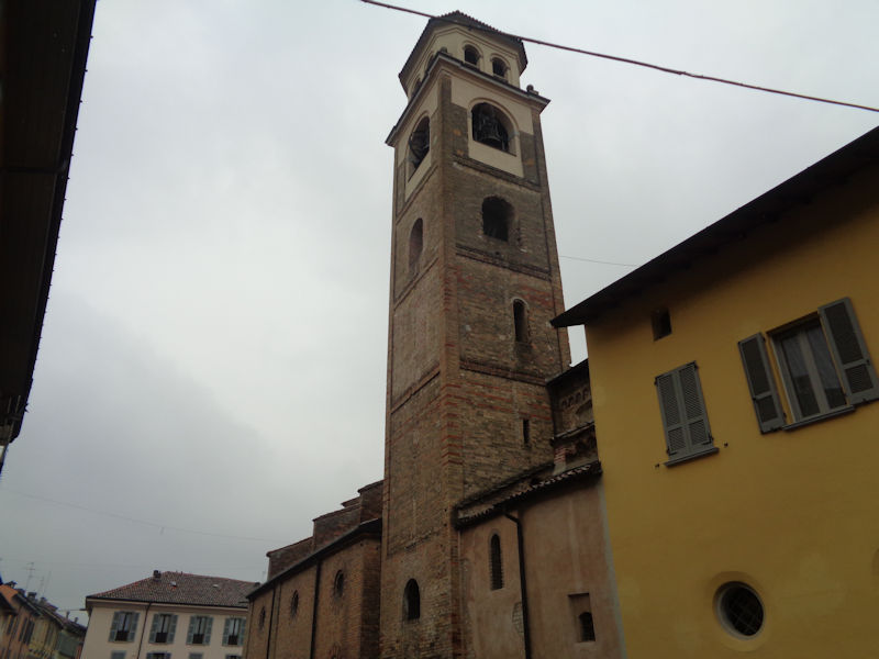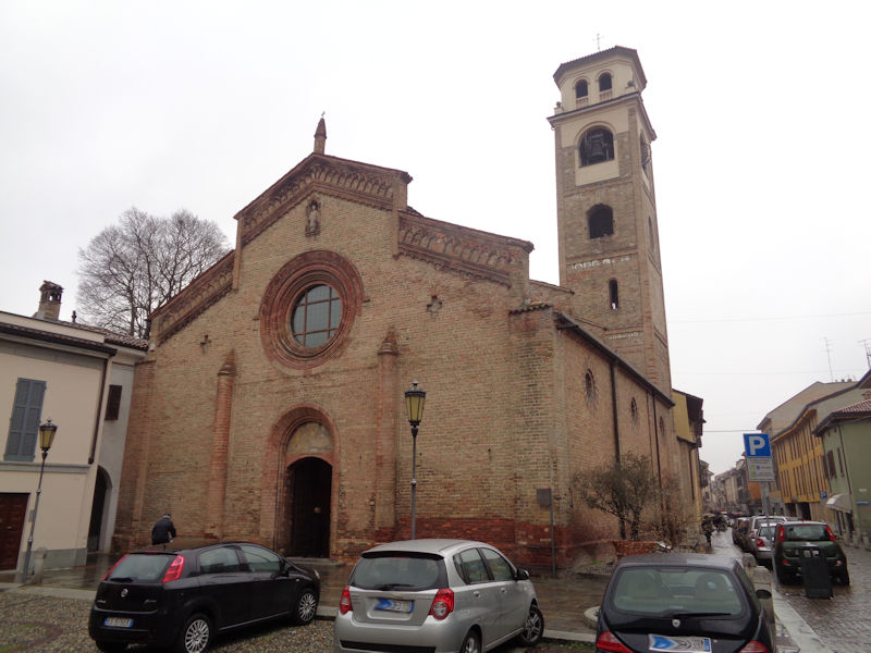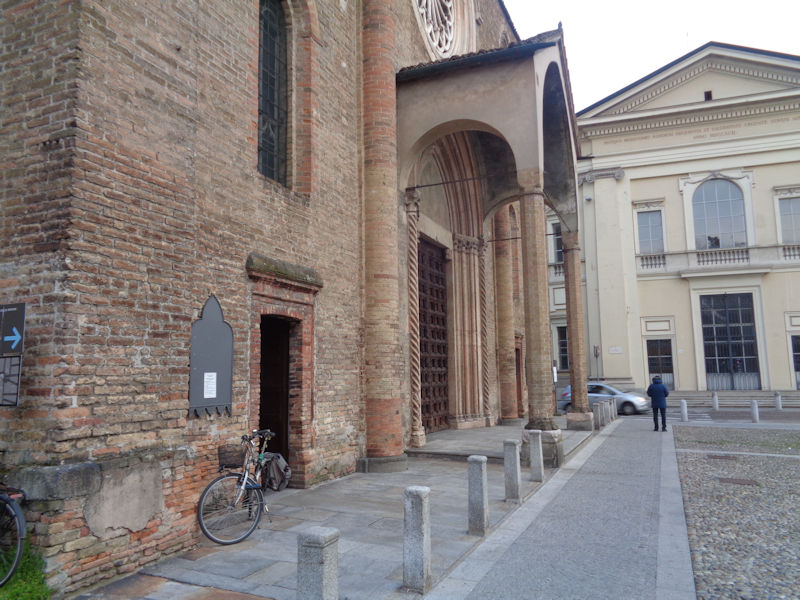The Italian Gothic, Franciscan-style church was built between 1280 and 1290, commissioned by the Bishop of Lodi Bongiovanni Fissiraga. The brick façade is unfinished. (That's a restored front of the 15th century original hospital in the background.)