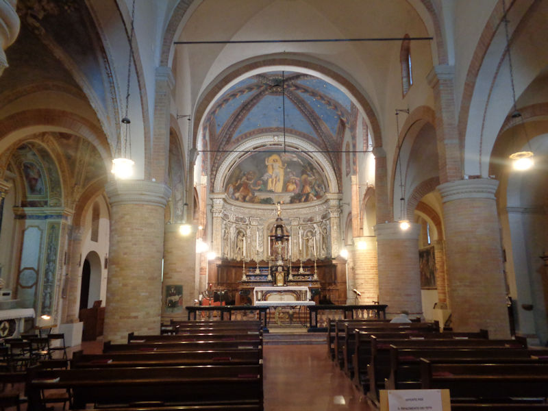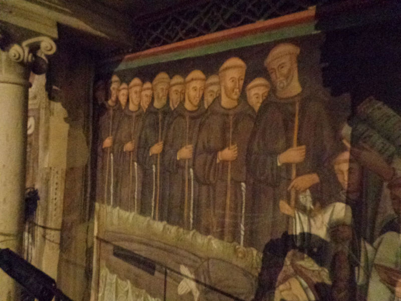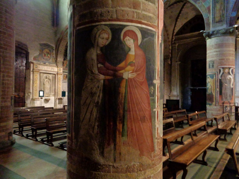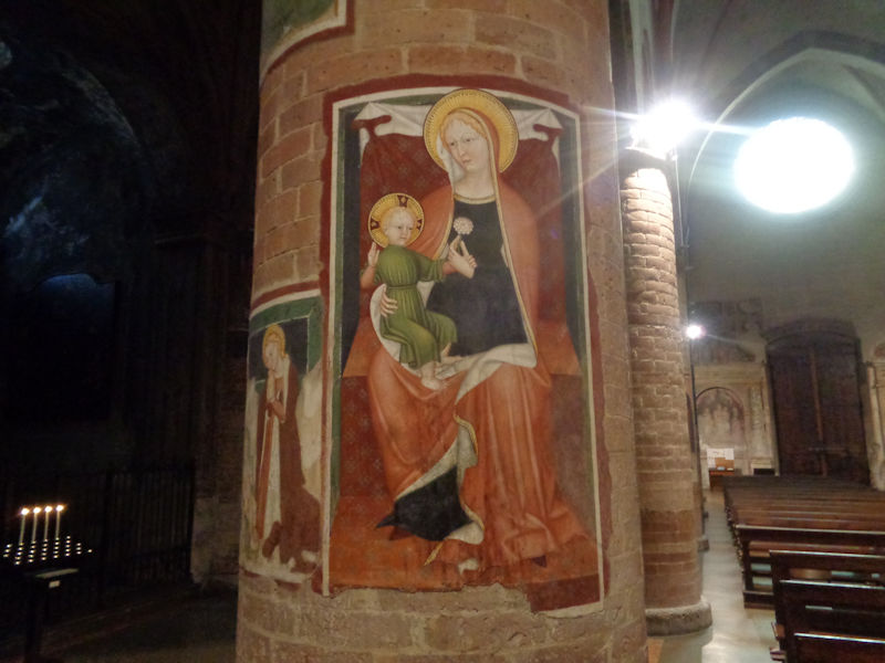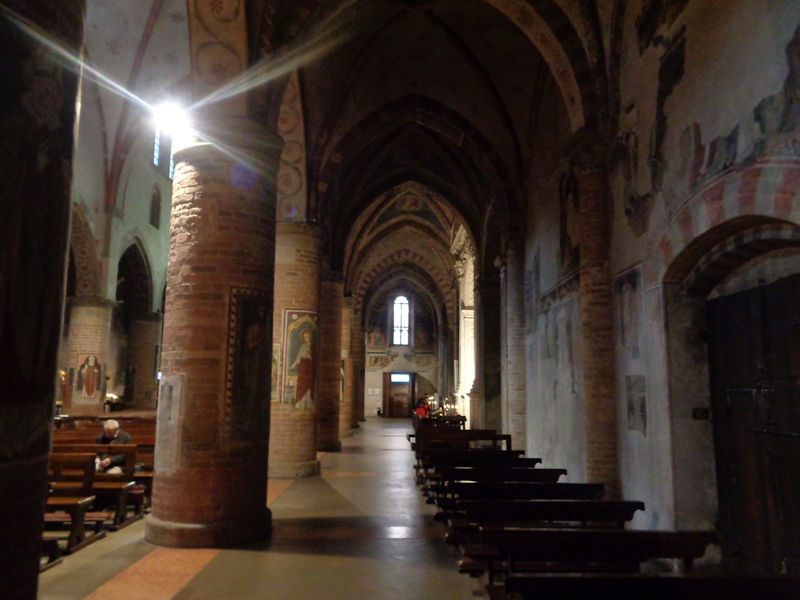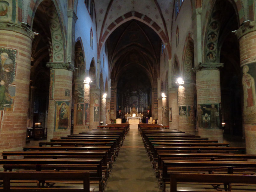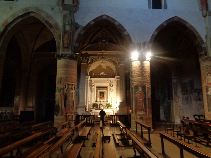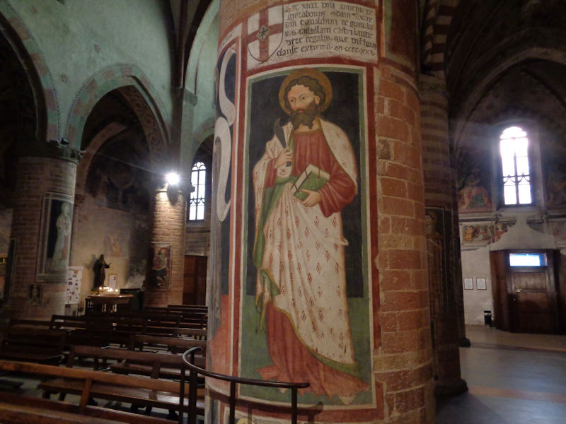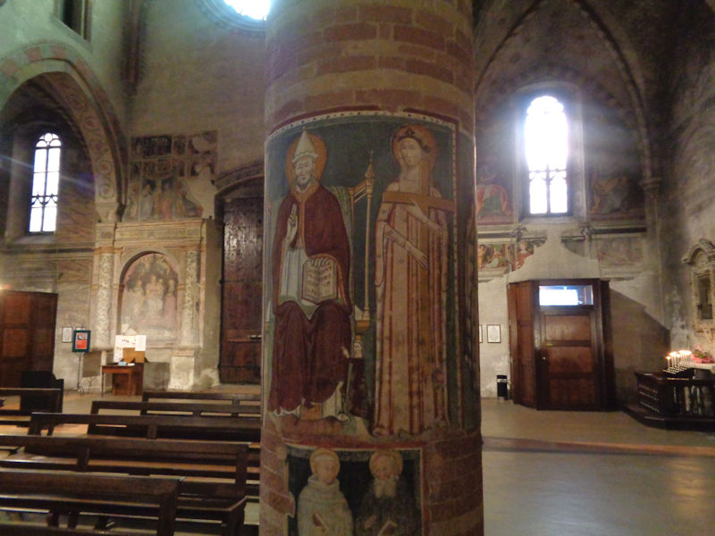 An amazing interior -- a Latin cross with a nave and two aisles, and with 14th to 16th frescoes on the walls and all over the columns.