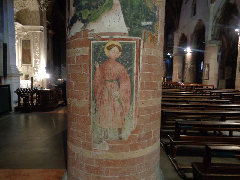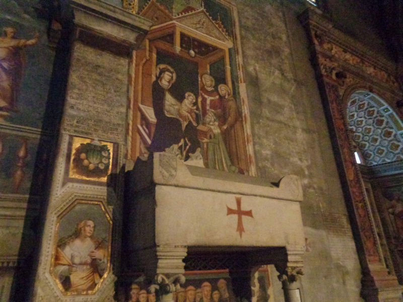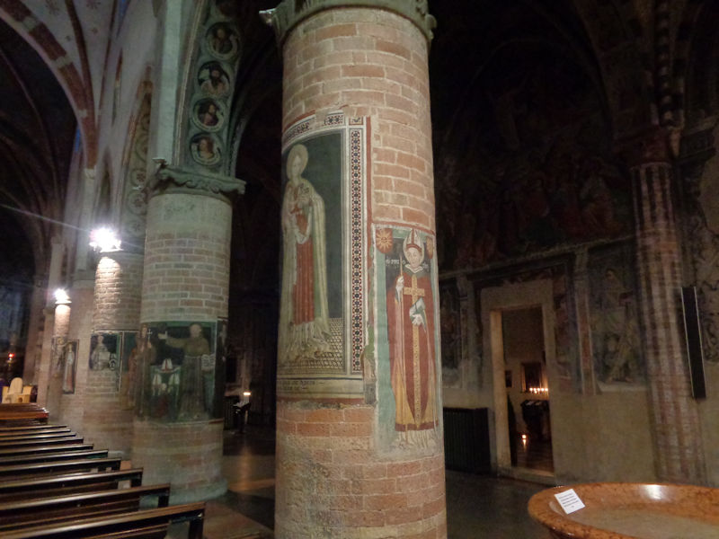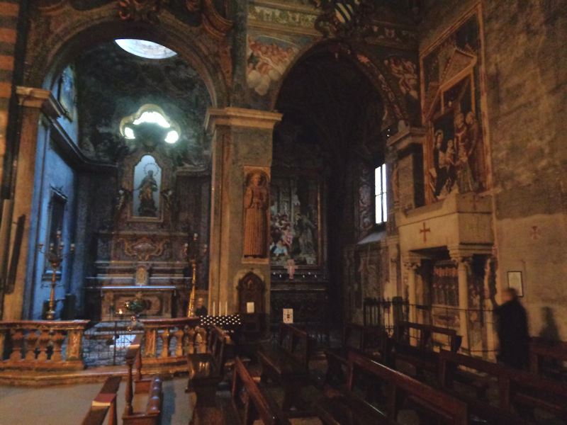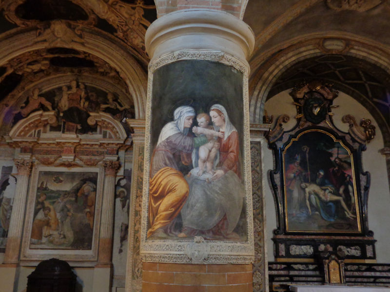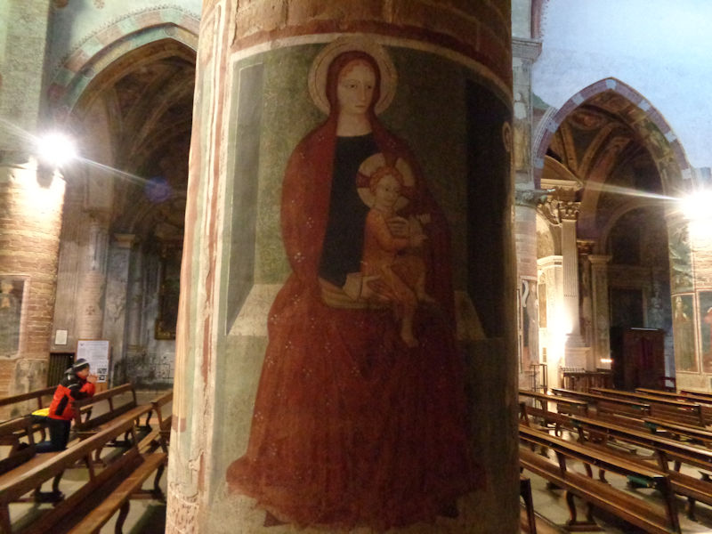 Is Fissiraga in there? Probably -- we've been instructed to look for a 14th century picture of 'Madonna with Child, Saints and Antonio Fissiraga', and that kneeling donor is presenting a building to Jesus. It was Antonio's financing that helped his (probably) uncle Bongiovanni the Bishop get this church built.