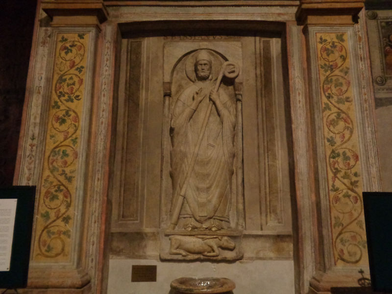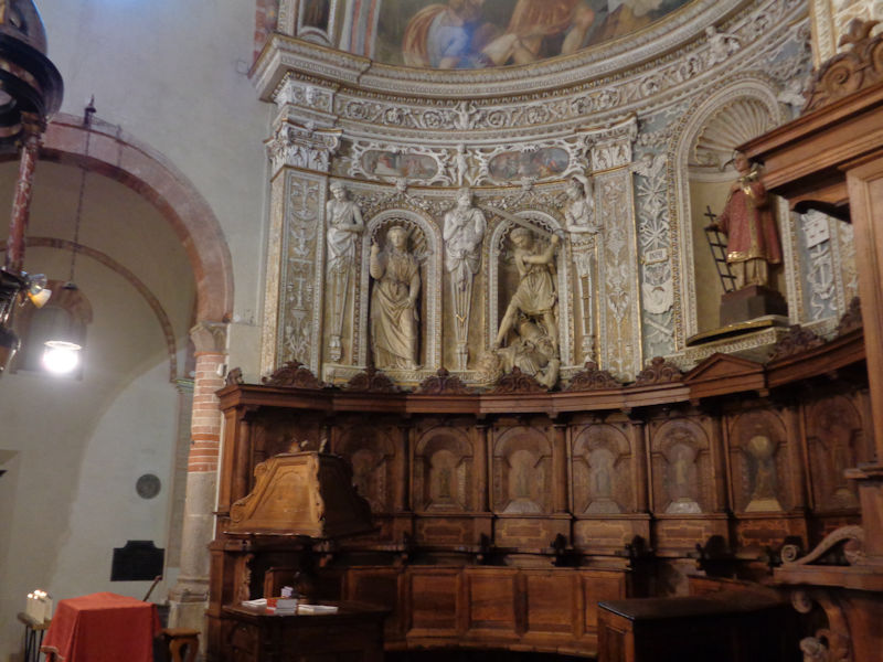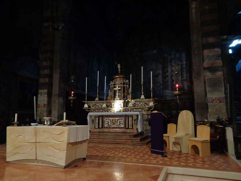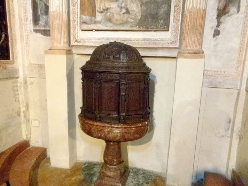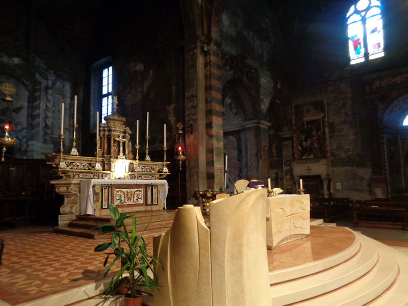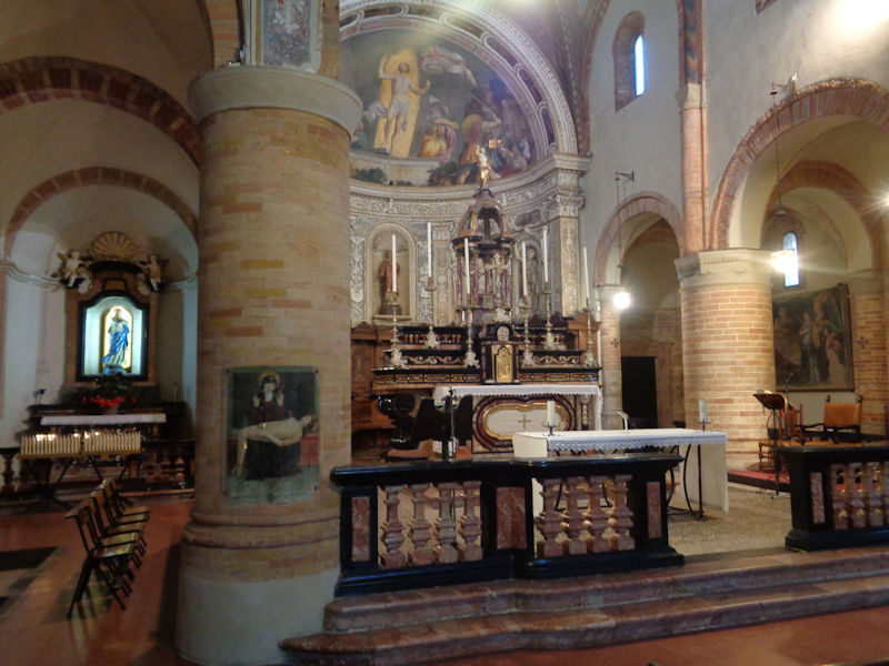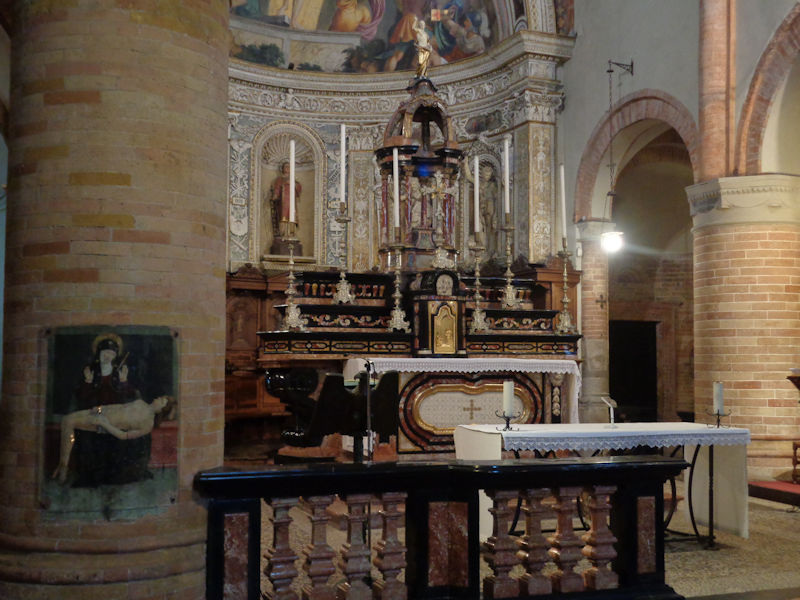 Is Fissiraga in there? Probably -- we've been instructed to look for a 14th century picture of 'Madonna with Child, Saints and Antonio Fissiraga', and that kneeling donor is presenting a building to Jesus. It was Antonio's financing that helped his (probably) uncle Bongiovanni the Bishop get this church built.