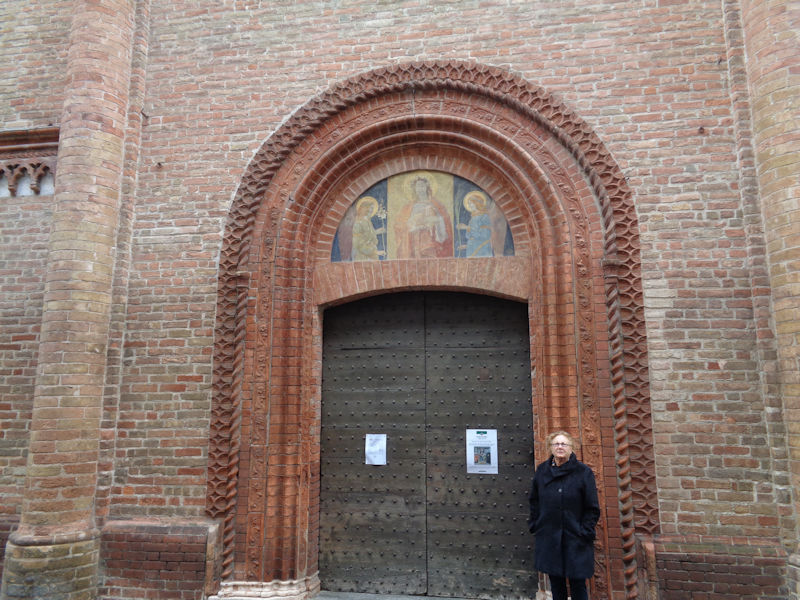 The Chiesa di Sant'Agnese, an Augustinian church from the 14th century, and Kristin -- who in fact is on the march back to the street market in the Piazza della Vittoria, or Piazza Maggiore, whilst I will descend into the former swamps of the Selvagreca district, where lie the free street parking zones, to see if our cute little Volvo is holding up okay in our absence.