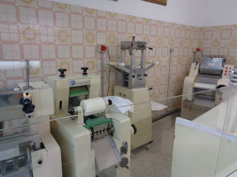 Reunited near the street market, on the way home our party descends upon a specialty pasta shop. That's an in-shop exhibition of some of the pasta-making machinery.