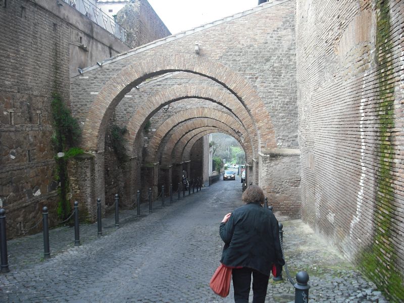 We're strolling up memory lane, the Vicolo de Cedro (that's the cedar tree right there on the left), past our old digs and up the stairs towards the Janiculum, where Kristin lived for a decade or so.