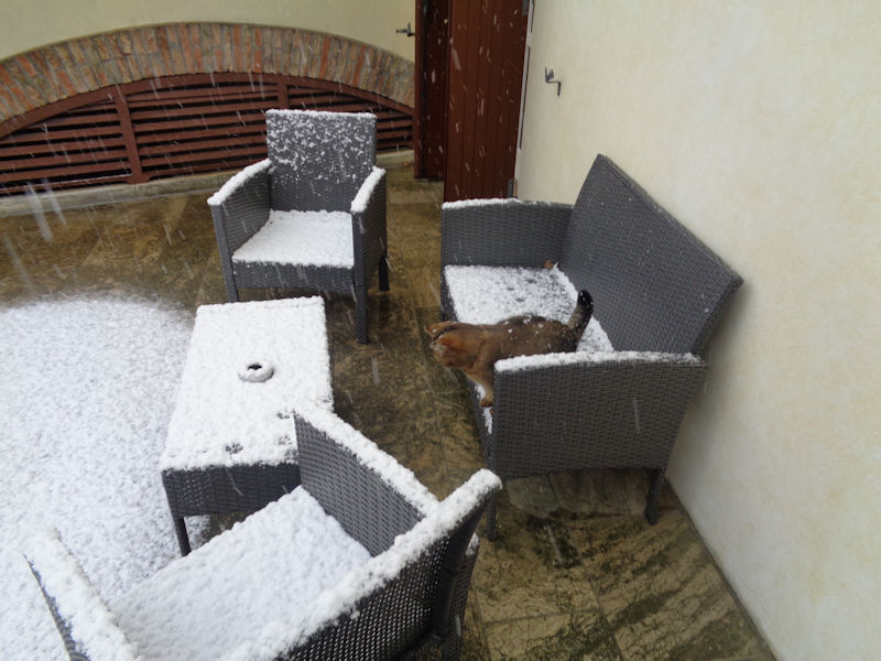 This is probably Melvin's first look at snow, no wonder he's doubtful . . .