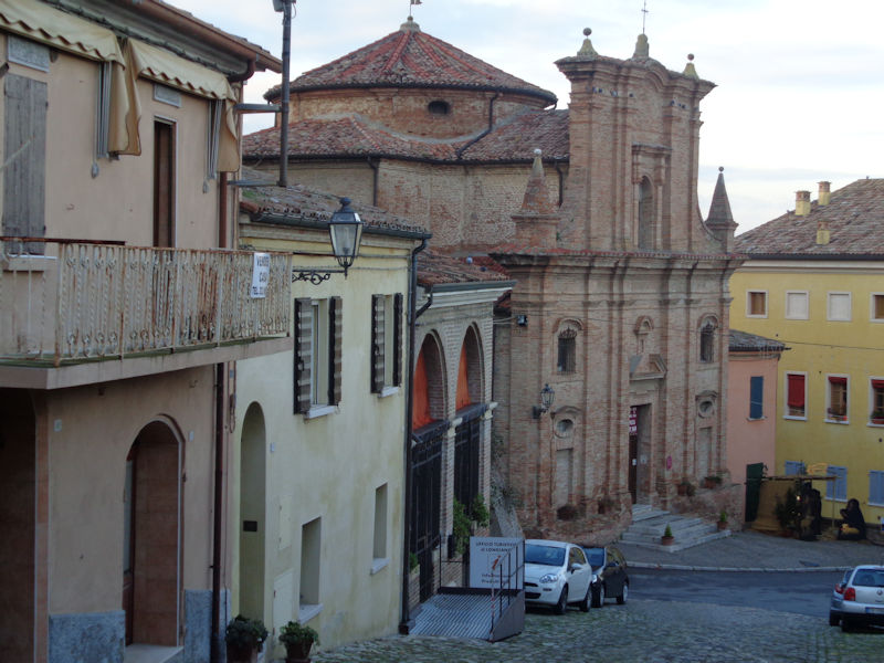 Up the Borgo Fausto, looking at the somewhat unpromising Parrocchia S. Cristoforo and, behind it, the Santuario SS. Crocifisso.