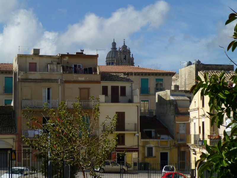 Finally we're here, having similarly roamed in vain all round Ragusa Superiore, the fairly undistinguished "new" town built after the earthquake of 1693, until we chanced upon our B+B (far left) nestled down between Upper Ragusa and Ragusa Ibla, the old town.