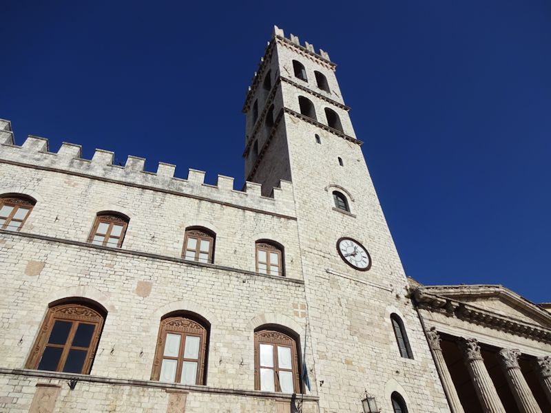 The town centre, the Piazza del Comune, on the site of the Roman Forum, dominated by the Torre del Popolo, Tower of the People, built in 1305, and the Palazzo dei Priori on the left