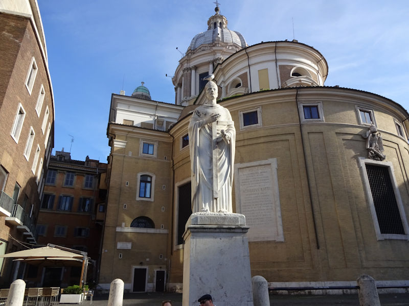 The elegant statue of St Ambrose, 4th century Bishop of Milan, in front of the back of the church of Sant'Ambrogio e San Carlo al Corso (dedicated to Ambrose and St Charles Borromeo, built to honor the latter's canonization in 1610), on the Piazza Augusto Imperatore facing the Mausoleum. (The front of the church faces onto the Via del Corso.)