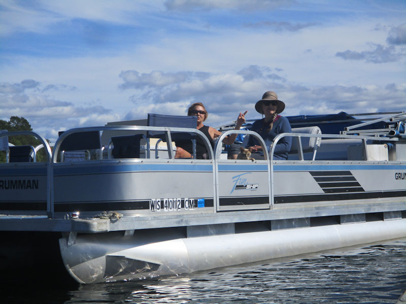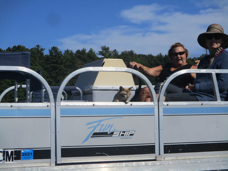 Another end-of-the-season chilly, rainy day. As usual on rainy days, we're camped on the pontoon boat at the boathouse dock, wading through a big book and providing refuge for . . .